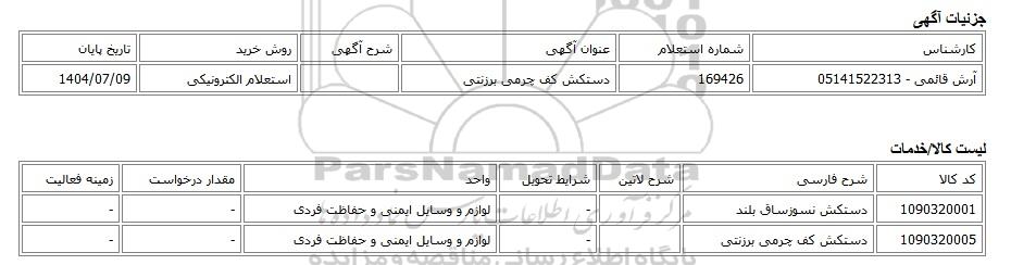 آرش قائمی - 05141522313 | 169426 | دستکش کف چرمی برزنتی | استعلام الکترونیکی | 1404/07/09 |