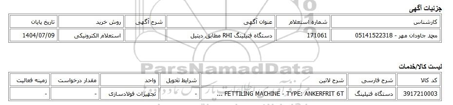 محمد جاودان مهر - 05141522318 | 171061 | دستگاه فتیلینگ RHI مطابق دیتیل | استعلام الکترونیکی | 1404/07/09 |