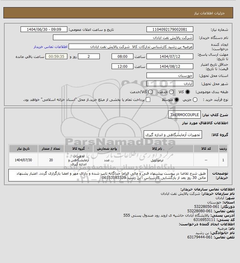 | 1 | -- | ترموکوپل | عدد | تجهیزات آزمایشگاهی و اندازه گیری | 20 | 1404/07/30 |