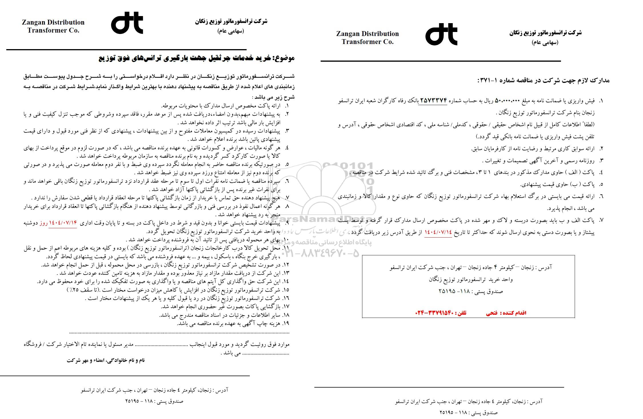 شرکت ترانسفورماتور توزیع زنگان در نظر دارد اقلام درخواستی را به شرح جدول پیوست مطابق زمانبندی های اعلام شده از طریق مناقصه به پیشنهاد دهنده با بهترین شرایط واگذار نماید. شرایط شرکت در مناقصه به شرح زیر می باشد