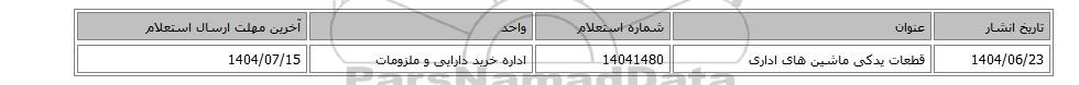 | 1404/06/23 | قطعات یدکی ماشین های اداری | 14041480 | اداره خرید دارایی و ملزومات | 1404/07/15 |