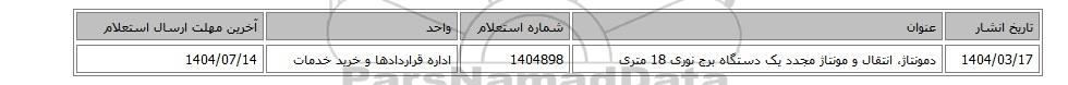 | 1404/03/17 | دمونتاژ، انتقال و مونتاژ مجدد یک دستگاه برج نوری 18 متری | 1404898 | اداره قراردادها و خرید خدمات | 1404/07/14 |