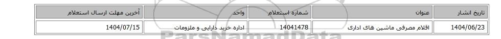 | 1404/06/23 | اقلام مصرفی ماشین های اداری | 14041478 | اداره خرید دارایی و ملزومات | 1404/07/15 |