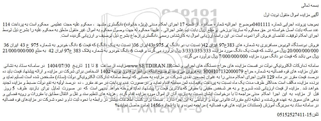 بموجب پرونده اجرایی شماره 0401111موضوع اجرائیه شماره صادره از شعبه 17 اجرای احکام مدنی (ویژه خانواده) دادگستری مشهد ، محکوم علیه حجت عظیمی محکوم است به پرداخت 114 عدد سکه بابت اصل خواسته در حق محکوم له سارینا برزخی و مبلغ ریال بابت نیم عشر اجرائی ، علیهذا محکوم له جهت وصول محکوم به اموال غیر منقول متعلق به محکوم علیه را بشرح ذیل توسط اجرای احکام توقیف، تقاضای فروش آنرا نموده است در این راستا ارزیابی اموال به کارشناس رسمی دادگستری ارجاع بشرح ذیل توصیف و ارزیابی گردیده است.