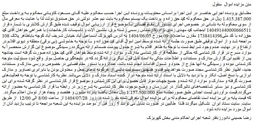 مطابق پرونده اجرایی حاضر در این اجرا براساس محتویات پرونده این اجرا حسب محکوم علیه آقای مسعود کاویانی محکوم به پرداخت مبلغ 1.415.387.000 ریال در حق محکوم له محمد حق زاده و پرداخت یک بیستم محکوم به بابت نیم عشر دولتی در حق صندوق دولت لذا با عنایت به معرفی مال از سوی محکوم له به نشانی در خصوص اجرای دستور آن مقام قضایی با موضوع قرار ارزیابی اموال توقیف شده طبق گزارش کلانتری با شماره قرار 140491440000666511 اینجانب محمد مهدی زندی نژاد (کارشناس رسمی رشته برق، ملشین آلات و تاسیسات کارخانجات) با همراهی خواهان آقای محمد حق زاده با کد ملی1738414396 مقارن ساعت09:30 مورخ 1404/06/05 به آدرس کهریزک اسماعیل آباد خیابان شریف آباد کوچه باباطاهر پلاک 108 مراجعه شد و از اموال توقیفی طبق صورت جلسه ارائه شده توسط امین اموال آقای محمد حق زاده و با توجه به خاموشی (بی برقی) منطقه و دپوی اقلام در ارتفاع و در نهایت عدم وجود شرایط تست با توجه به ظاهر اقلام به شرح جدول پیوست ضمائم ارائه می گردد.رسیدگی موضوع این گزارش منحصراً به موارد مسرح در قرار کارشناسی که حاکی از مطالعه قرار کارشناسی مدارک و موارد ارائه شده توسط خواهان آقای محمد حق زاده صورت گرفته است چنانچه پس از تقدیم این گزارش مدارک و مستندات و اطلاعات متکی به اسناد قابل قبول دیگری ارائه گردد که در نتیجه گیری حاصل موثر واقع شود مسئولیت متوجه کارشناس نبوده و رسیدگی به آنها خارج از حدود و شمول اقدامات انجام شده باشد، عندالزوم با دستور مقام قضایی در خصوص بررسی مدارک و مستندات جدید، اظهار نظر کارشناسی مجدد صورت خواهد پذیرفت و همچنین مسئولیت ناشی از هرگونه ادعای جعل و مخدوش بودن یا نابرابری تصاویر و مدارک ابرازی با نسخ اصل، انکار و یا تردید به دلایل با اسناد ارائه شده متوجه ابراز کننده اسناد مدارک و دلایل می باشد. نظریه کارشناسی با توجه به فعالیت های صورت گرفته و مدارک و موارد ارائه شده و جمیع جهات موثر قابل حصول برای این کارشناس و موضوع قرار کارشناسی در نظر گرفته شده برای این کارشناسی و نیز سایر شاخصه های تاثیرگذار در این زمان و وضع موجود، نظر کارشناسی به شرح زیر در رابطه با قرار کارشناسی به حضور ارائه می گردد.قیمت برآوردی لیست اجناس طبق صورتجلسه مبلغ 1.157.500.000 ریال معادل یکصد پانزده میلیون و هفتصد و پنجاه هزار تومان اعلام میگردد. که قیمت پایه برای مزایده است تقاضای محکوم له برای مزایده اموال معرفی شده مقرر شده در روز 1404/07/28 از ساعت 8/00 الی 12/00 از طریق سایت. سایت ستاد ایران تشکیل میگردد فلذا طالبین در صورت تمایل می توانند 5 روز قبل از موعد مزایده به این شعبه مراجعه تا ترتیب بازدید آنان از اموال مورد مزایده داده شود .