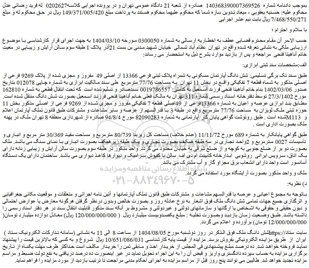 بموجب دادنامه شماره 140368390007369526 صادره از شعبه 21 دادگاه عمومی تهران و در پرونده اجرایی کلاسه0202627 له فرید رضائی عدل محکوم علیه: حسنیه یعقوبی - میعاد تدوین سازه شما که محکوم علیهما محکوم هستند به پرداخت مبلغ 149/371/005/420 ریال در حق محکوم له و مبلغ 7/468/550/271 ریال بابت نیم عشر اجرایی