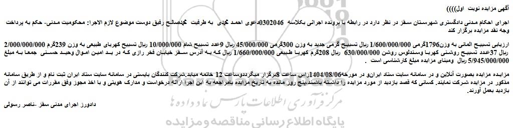 اجرای احکام مدنی دادگستری شهرستان سقز در نظر دارد در رابطه با پرونده اجرائی بکلاسه 0302046دعوی احمد محمدی به طرفیت محمدصالح رفیق دوست موضوع لازم الاجرا: محکومیت مدنی- حکم به پرداخت وجه نقد مزایده برگزار کند