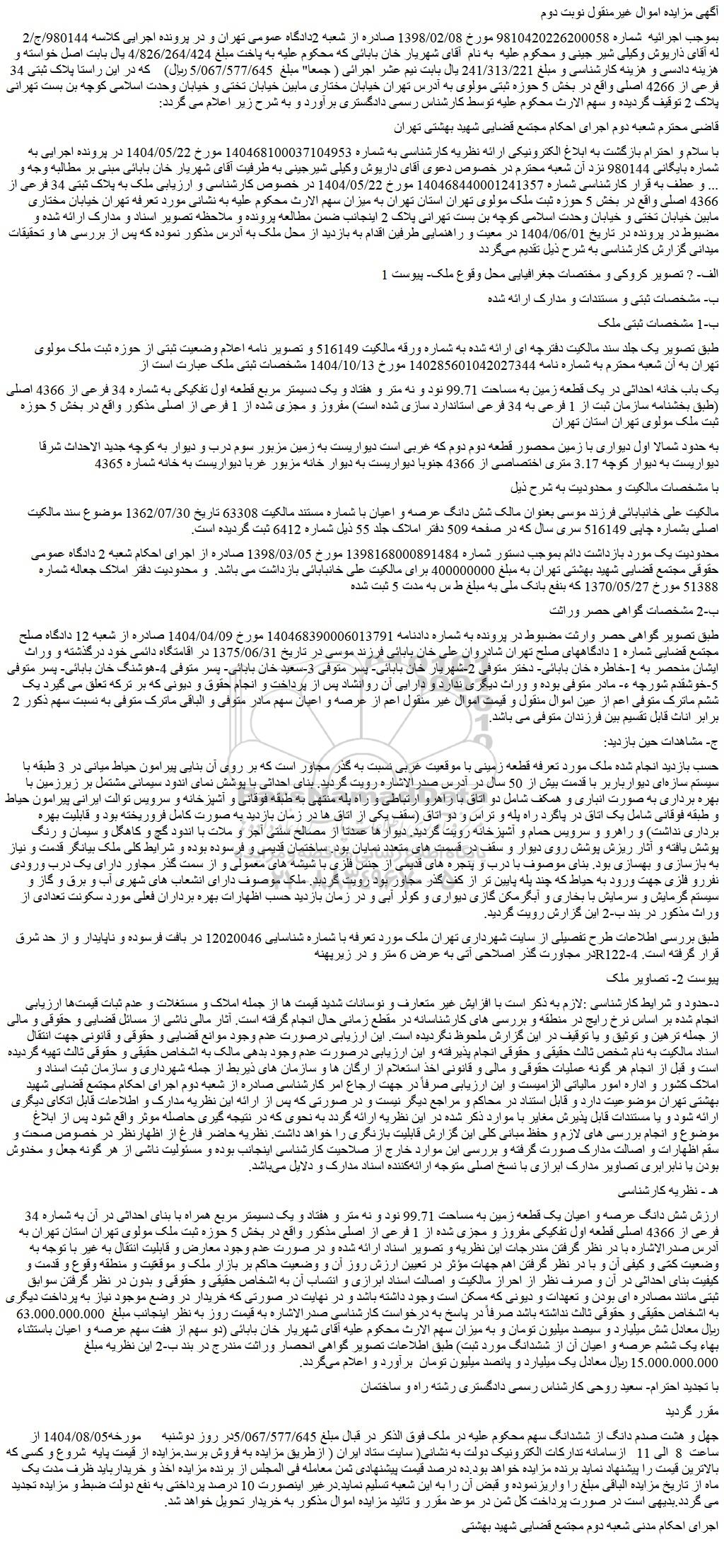با سلام و احترام بازگشت به ابلاغ الکترونیکی ارائه نظریه کارشناسی به شماره 140468100037104953 مورخ 1404/05/22 در پرونده اجرایی به شماره بایگانی 980144 نزد آن شعبه محترم در خصوص دعوی آقای داریوش وکیلی شیرجینی به طرفیت آقای شهریار خان بابائی مبنی بر مطالبه وجه و ... و عطف به قرار کارشناسی شماره 140468440001241357 مورخ 1404/05/22 در خصوص کارشناسی و ارزیابی ملک به پلاک ثبتی 34 فرعی از 4366 اصلی واقع در بخش 5 حوزه ثبت ملک مولوی تهران استان تهران به میزان سهم الارث محکوم علیه به نشانی مورد تعرفه تهران خیابان مختاری مابین خیابان تختی و خیابان وحدت اسلامی کوچه بن بست تهرانی پلاک 2 اینجانب ضمن مطالعه پرونده و ملاحظه تصویر اسناد و مدارک ارائه شده و مضبوط در پرونده در تاریخ 1404/06/01 در معیت و راهنمایی طرفین اقدام به بازدید از محل ملک به آدرس مذکور نموده که پس از بررسی ها و تحقیقات میدانی گزارش کارشناسی به شرح ذیل تقدیم می گردد