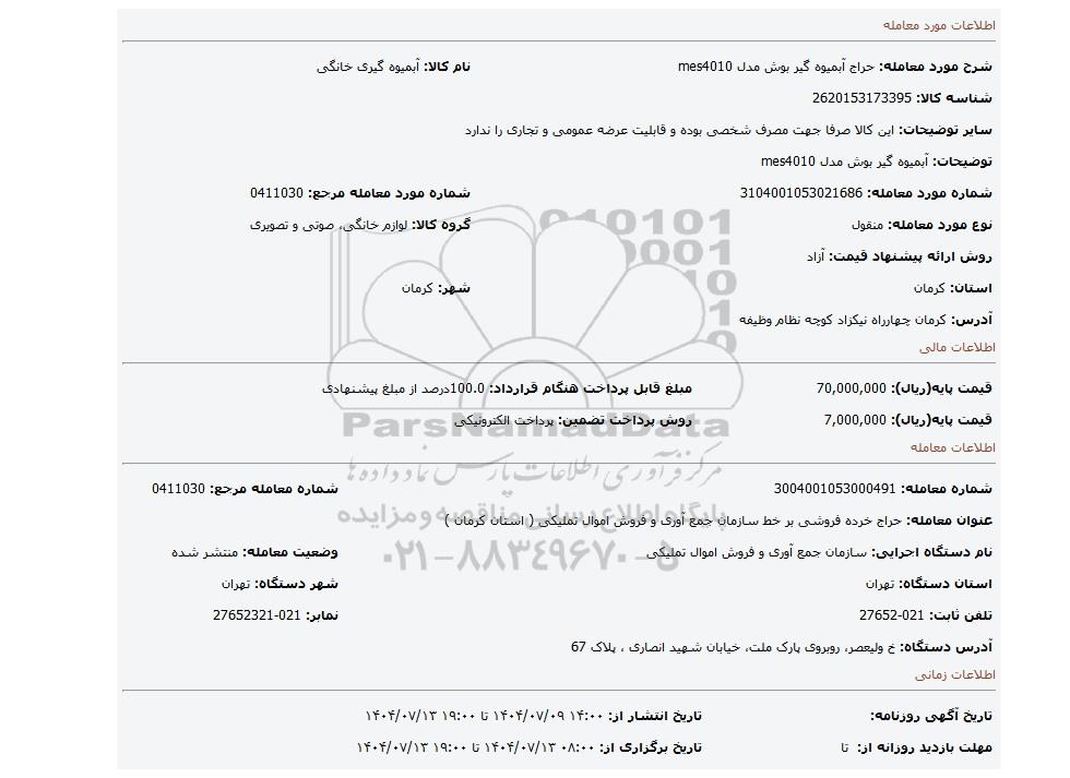 | عنوان معامله: حراج خرده فروشی بر خط سازمان جمع آوری و فروش اموال تملیکی ( استان کرمان ) | ||