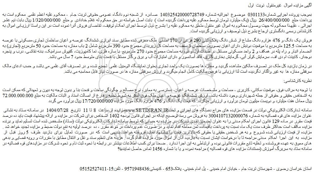 بموجب پرونده اجرایی شماره0301133 موضوع اجرائیه شماره 140325420000728749 صادره از شعبه دوم دادگاه عمومی حقوقی تربت جام ، محکوم علیه اعظم علمی محکوم است به پرداخت مبلغ 26/400/000/000 ریال (یک میلیارد تومان توسط محکوم علیه پرداخت گردیده است ) بابت اصل خواسته در حق محکوم له غلام خدادادی و مبلغ 1/320/000/000 ریال بابت نیم عشر اجرائی ، علیهذا محکوم له جهت وصول محکوم به اموال غیر منقول متعلق به محکوم علیه را بشرح ذیل توسط اجرای احکام توقیف، تقاضای فروش آنرا نموده است در این راستا ارزیابی اموال به کارشناس رسمی دادگستری ارجاع بشرح ذیل توصیف و ارزیابی گردیده است.