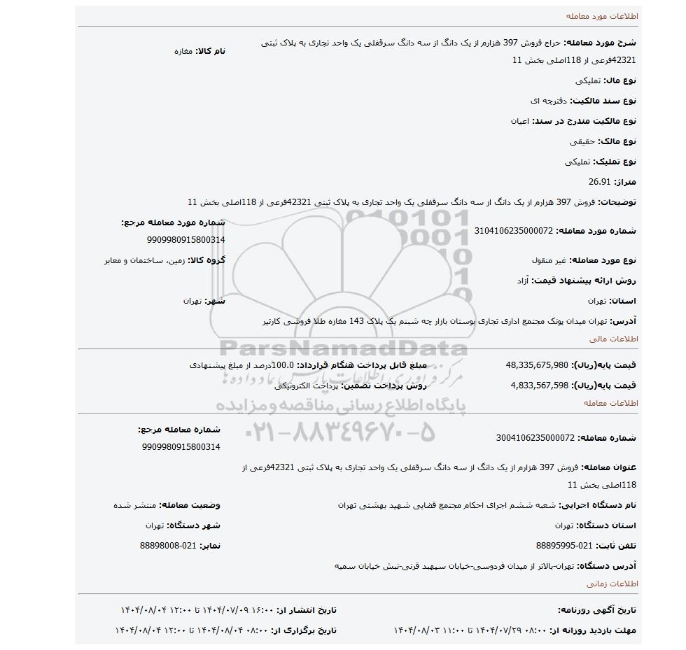 | شرح مورد معامله: حراج فروش 397 هزارم از یک دانگ از سه دانگ سرقفلی یک واحد تجاری به پلاک ثبتی 42321فرعی از 118اصلی بخش 11 | نام کالا: مغازه | |