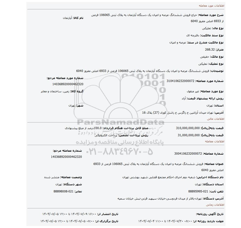 | شرح مورد معامله: حراج فروش ششدانگ عرصه و اعیان یک دستگاه آپارتمان به پلاک ثبتی 106065 فرعی از 6933 اصلی مفروز 6040 | نام کالا: آپارتمان | |