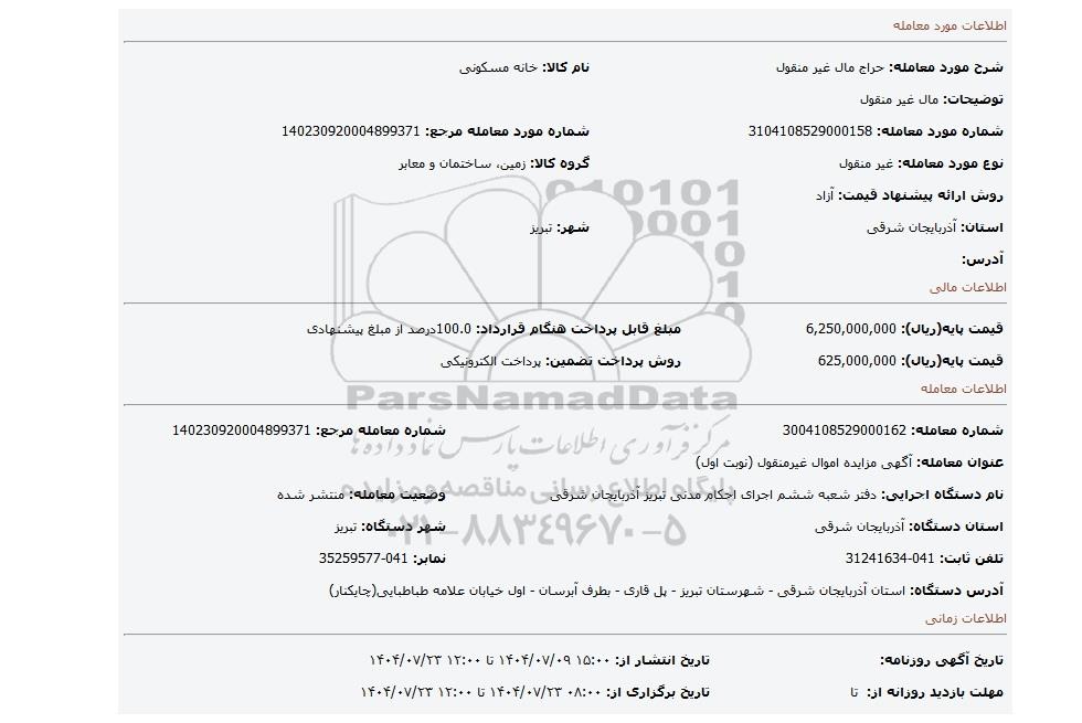 | نام دستگاه اجرایی: دفتر شعبه ششم اجرای احکام مدنی تبریز آذربایجان شرقی | وضعیت معامله: منتشر شده | |