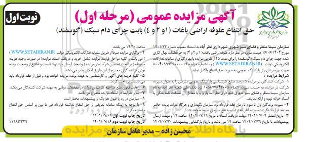 سازمان سیما منظر و فضای سبز شهری شهرداری نظر آباد به استناد مصوبه شماره 1201.23 مورخ 1404.6.16 هیئت مدیره در نظر دارد. علوفه اراضی باغات (1 و 2 و 4) به جز قطعات نهال کاری شده جهت چرای دام سبک (گوسفند) را برای مدت 6045 از طریق مزایده با بهره گیری از سامانه تدارکات الکترونیکی دولت و با شماره مزایده 5004099933000019 جهت بهره برداری از پارکینگ عمومی به صورت حق انتفاع واگذار نماید