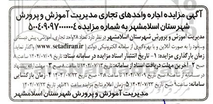آگهی مزایده اجاره واحدهای تجاری مدیریت آموزش و پرورش شهرستان اسلامشهر به شماره مزایده 5004090970000004 ؟
