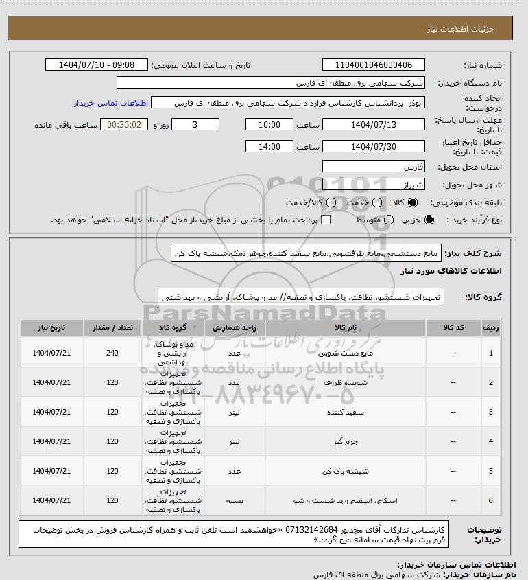نام دستگاه خریدار:شرکت سهامی برق منطقه ای فارس