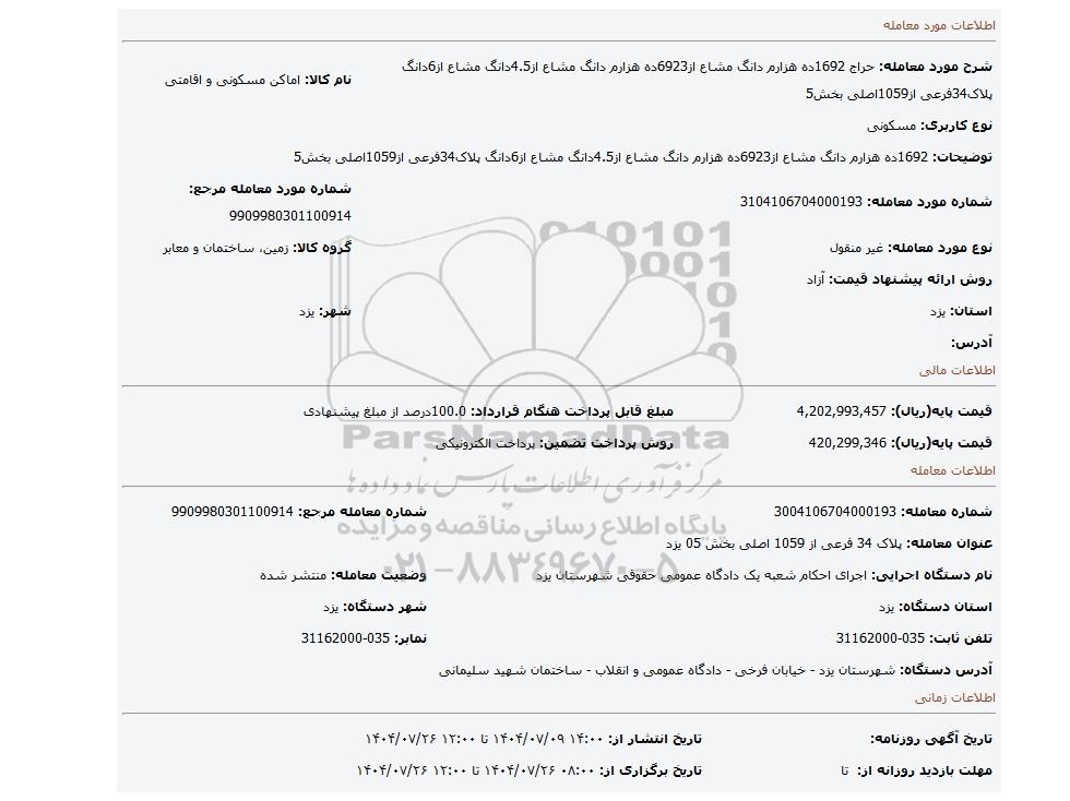 مزایده عمومی مزایده 1692ده هزارم دانگ مشاع از6923ده هزارم دانگ مشاع از4.5دانگ مشاع از6دانگ پلاک34فرعی از1059اصلی بخش5 برگزار میگردد. از کلیه افراد متخصص و شرکتهای واجد شرایط دعوت به عمل میآید تا در این مزایده با کد خبرگزاری پارس نماد : 9634445 شرکت نمایند تاریخ شروع مزایده : 1404/07/09 مهلت شرکت در مزایده: تا پایان روز 1404/07/26