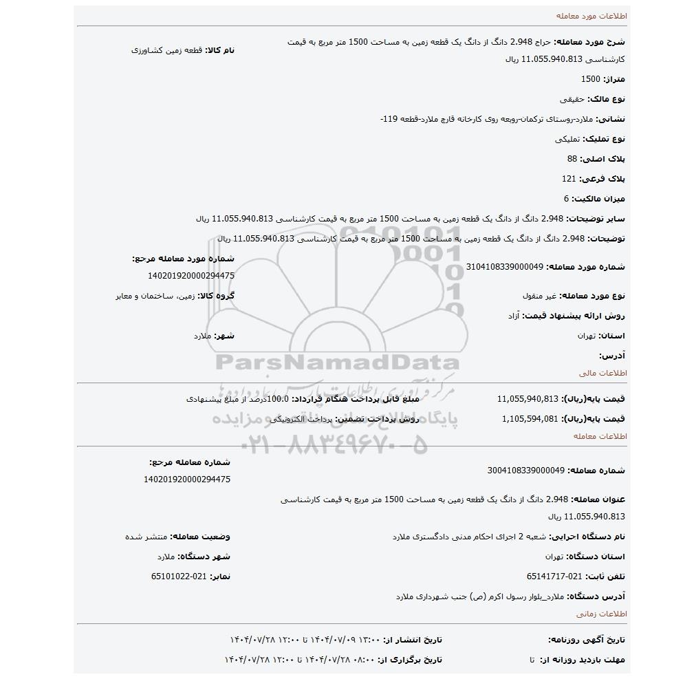 | عنوان معامله: 2.948 دانگ از دانگ یک قطعه زمین به مساحت 1500 متر مربع به قیمت کارشناسی 11.055.940.813 ریال | ||