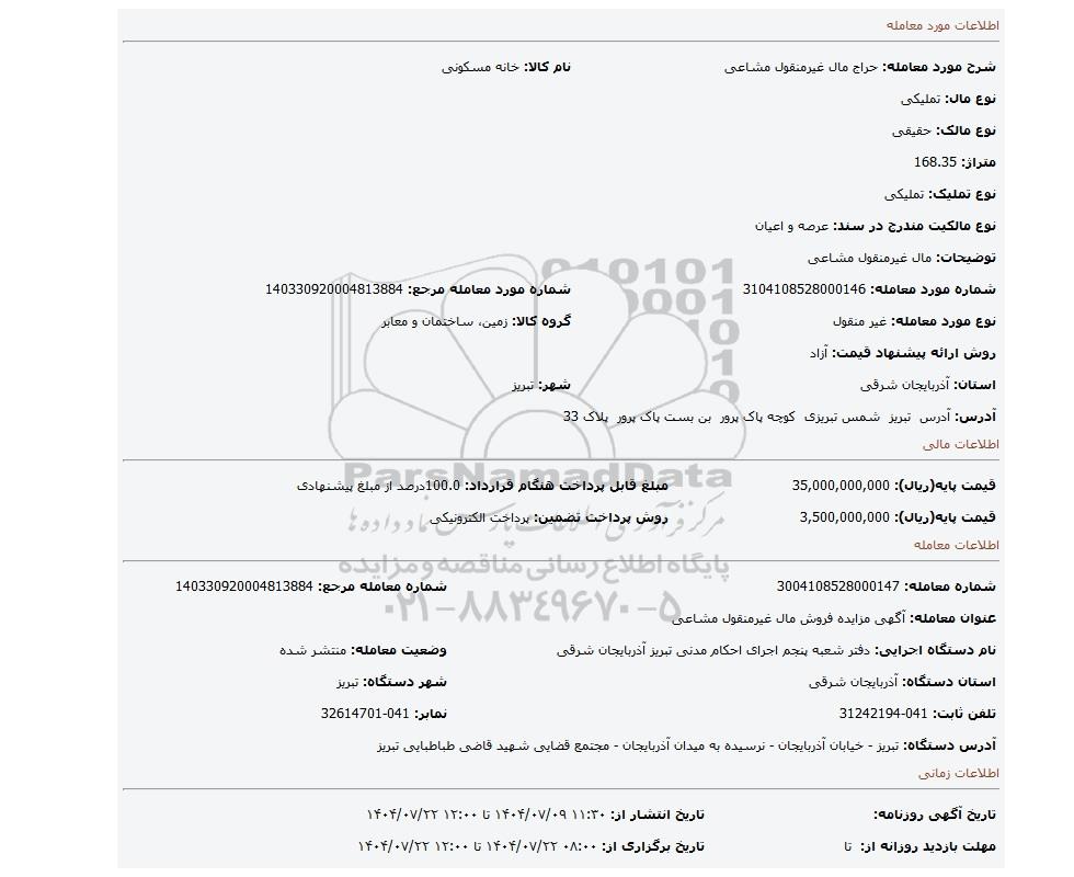 | شرح مورد معامله: حراج مال غیرمنقول مشاعی | نام کالا: خانه مسکونی | |