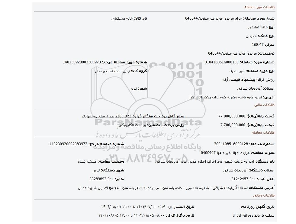| توضیحات: مزایده اموال غیر منقول0400447 | ||