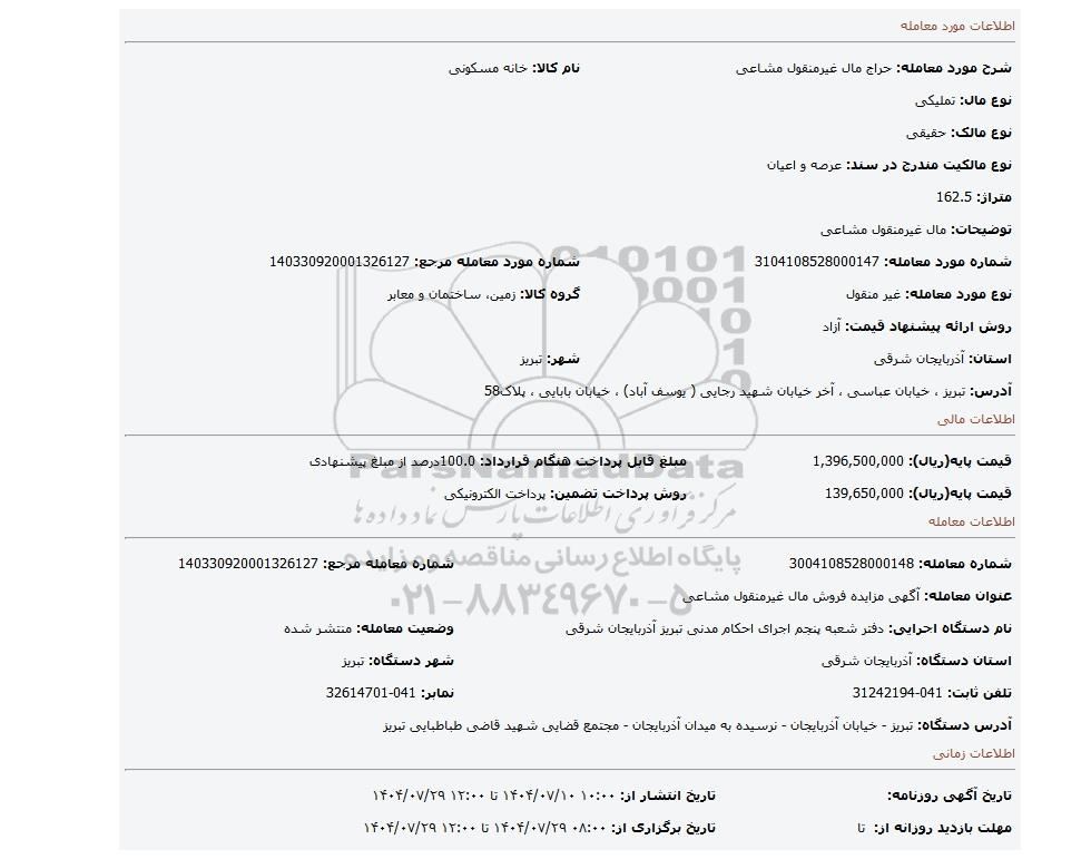 | عنوان معامله: آگهی مزایده فروش مال غیرمنقول مشاعی | ||