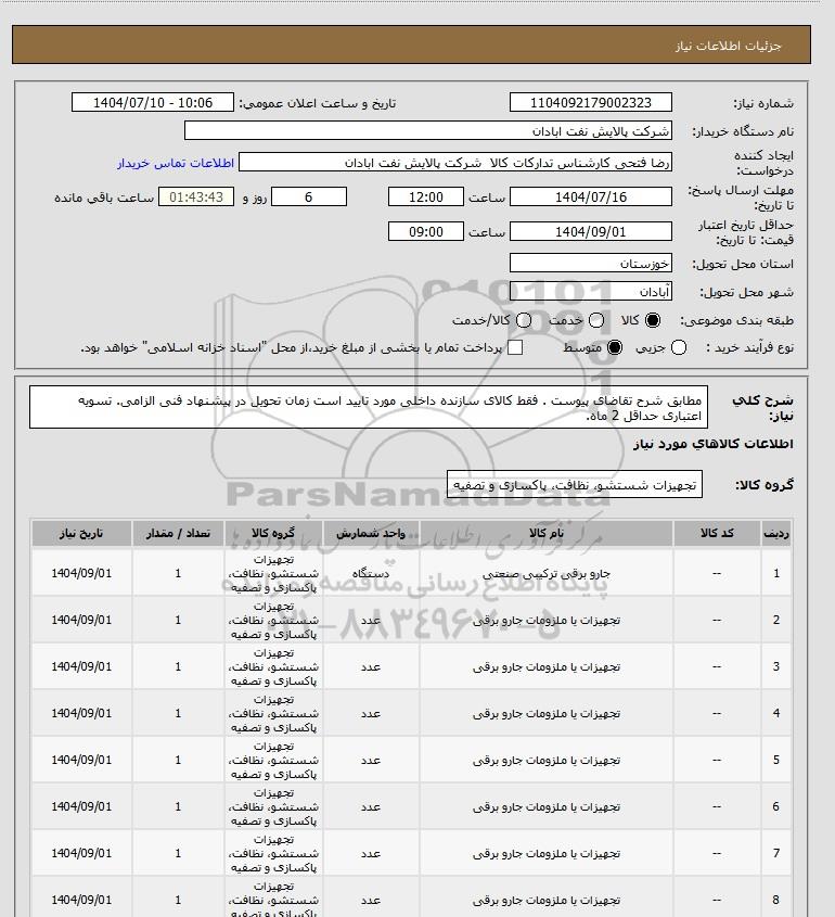 شرح کلی نیاز: مطابق شرح تقاضای پیوست . فقط کالای سازنده داخلی مورد تایید است زمان تحویل در پیشنهاد فنی الزامی. تسویه اعتباری حداقل 2 ماه.