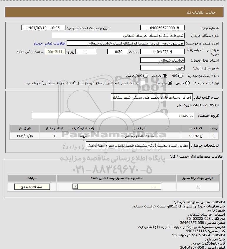 شرح کلی نیاز: اجرای زیرسازی فاز 3 نهضت ملی مسکن شهر تیتکانلو