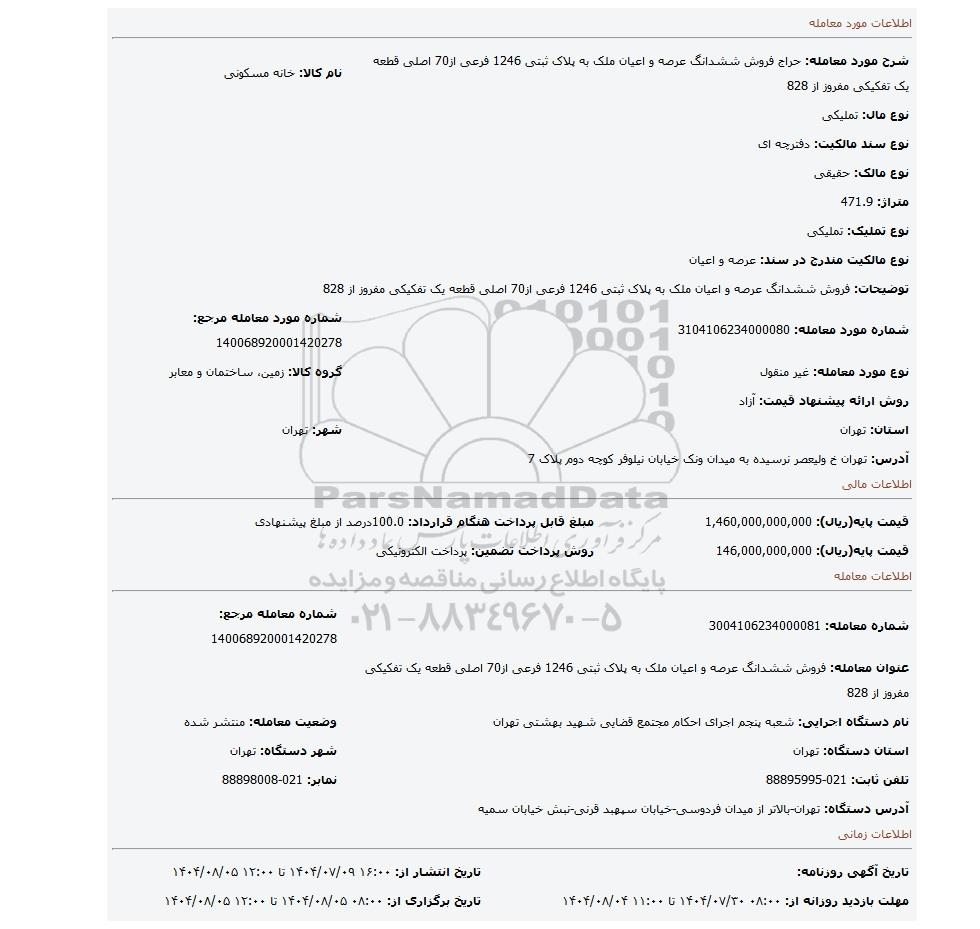 | شماره معامله: 3004106234000081 | شماره معامله مرجع: 140068920001420278 | |