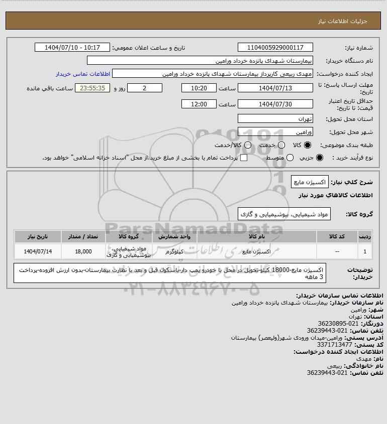 توضیحات خریدار:اکسیژن مایع-18000 کیلو-تحویل در محل با خودرو پمپ دار-باسکول قبل و بعد با نظارت بیمارستان-بدون ارزش افزوده-پرداخت 3 ماهه