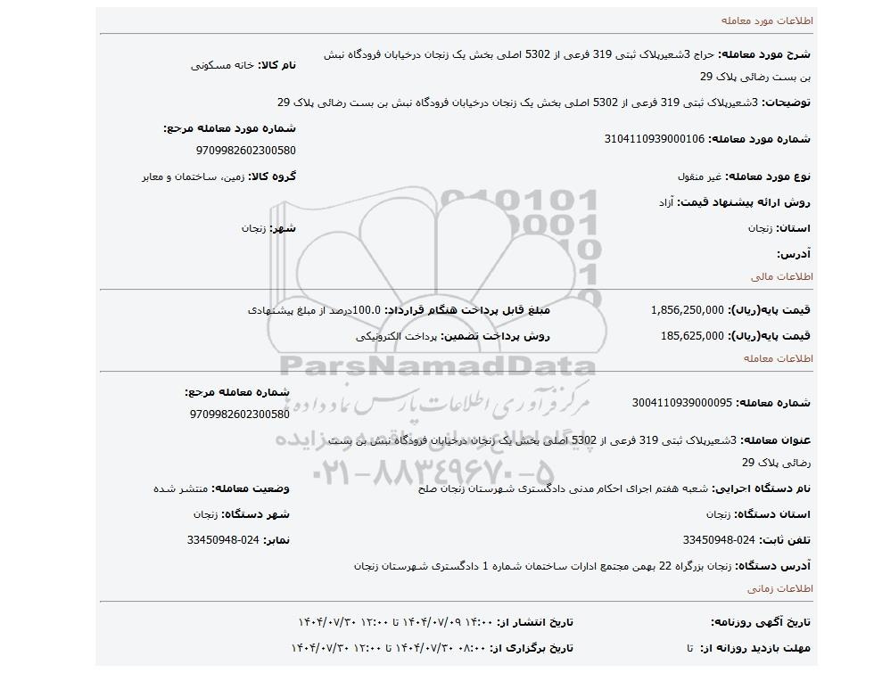 شرح مورد معامله: حراج 3شعیرپلاک ثبتی 319 فرعی از 5302 اصلی بخش یک زنجان درخیابان فرودگاه نبش بن بست رضائی پلاک 29 نام کالا: خانه مسکونی
