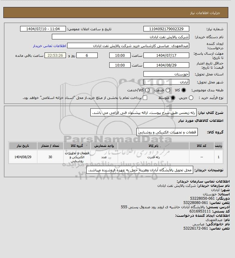 | 1 | -- | رله قدرت | عدد | قطعات و تجهیزات الکتریکی و روشنایی | 30 | 1404/08/29 |