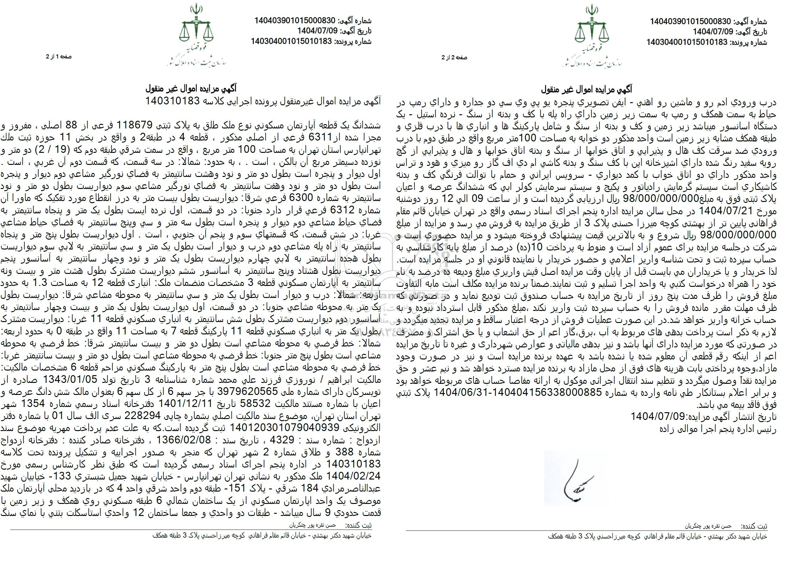 ششدانگ یک قطعه آپارتمان مسکونی نوع ملک طلق به پلاک ثبتی 118679 فرعی از 88 اصلی ، مفروز و مجزا شده از 6311 فرعی از اصلی مذکور ، قطعه 4 در طبقه 2 و واقع در بخش 11 حوزه ثبت ملك تهرانپارس استان تهران به مساحت 100 متر مربع ، واقع در سمت شرقي طبقه دوم که (19) . (2) دو متر و نوزده دسیمتر مربع آن بالکن ، است . ، به حدود شمالا در سه قسمت که قسمت دوم آن غربي ، است . اول دیوار و پنجره است بطول دو متر و نود و هشت سانتیمتر به فضای نورگیر مشاعي دوم دیوار و پنجره است بطول دو متر و نود و هفت سانتیمتر به فضاي نورگیر مشاعي سوم ديواريست بطول دو متر و نود سانتیمتر به شماره 6300 فرعي شرقا ديواريست بطول بيست متر به درز انقطاع مورد تفکیک که ماورا آن شماره 6312 فرعي قرار دارد جنوبا در دو قسمت اول نرده ایست بطول یک متر و پنجاه سانتیمتر به فضاي حياط مشاعي دوم ديوار و پنجره است بطول سه متر و سی و پنج سانتیمتر به فضای حياط مشاعی غربا در شش قسمت که قسمتهای سوم و پنجم آن جنوبی ، است. اول دیواریست بطول پنج متر و پنجاه سانتیمتر به راه پله مشاعی دوم درب و دیوار است بطول یک متر و سي سانتیمتر به لابي سوم دیواریست بطول هجده سانتیمتر به لابی چهارم دیواریست بطول یک متر و نود و چهار سانتیمتر به آسانسور پنجم دیواریست بطول هشتاد و پنج سانتیمتر به آسانسور ششم دیواریست مشترک بطول هشت متر و بیست و نه سانتیمتر به آپارتمان مسکوني قطعه 3 مشخصات منضمات ملک انباری قطعه 12 به مساحت 1.3 به حدود اربعه شمالا درب و دیوار است بطول یک متر و سي سانتیمتر به محوطه مشاعي شرقا دیواریست بطول یک متر به محوطه مشاعي جنوبا در دو قسمت اول دیواریست بطول یک متر و بیست و چهار سانتیمتر به آسانسور دوم دیواریست مشترک بطول شش سانتیمتر به انباري مسكوني قطعه 11 غربا دیواریست مشترک بطول یک متر به انباري مسکوني قطعه 11 پارکینگ قطعه 7 به مساحت 11 واقع در طبقه 0 به حدود اربعه شمالا خط فرضي به محوطه مشاعي است بطول دو متر و بیست سانتیمتر شرقا خط فرضی به محوطه مشاعي است بطول پنج متر جنوبا خط فرضی به محوطه مشاعی است بطول دو متر و بیست سانتیمتر غربا خط فرضي به محوطه مشاعی است بطول پنج متر به پارکینگ مسکوني مزاحم قطعه 6 مشخصات مالکیت مالکیت ابراهيم . نوروزي فرزند علي محمد شماره شناسنامه 3 تاریخ تولد 1343.01.05 صادره از تویسرکان دارای شماره ملی 3979620565 با جز سهم 6 از کل سهم 6 بعنوان مالک شش دانگ عرصه و اعیان با شماره مستند مالکیت 58532 تاريخ 1401.12.11 دفترخانه اسناد رسمي شماره 1354 شهر تهران استان تهران موضوع سند مالكيت اصلي بشماره چاپی 228294 سری الف سال 01 با شماره دفتر الکترونیکی 140120301079040939 ثبت گردیده است که به علت عدم پرداخت مهریه موضوع سند ازدواج : شماره سند : 4329 ، تاریخ سند : 1366.02.08 ، دفترخانه صادر کننده : دفترخانه ازدواج شماره 388 و طلاق شماره 2 شهر تهران که منجر به صدور اجراییه و تشکیل پرونده تحت کلاسه 140310183 در اداره پنجم اجرای اسناد رسمی گردیده است که طبق نظر کارشناس رسمی مورخ 1404.02.24 ملک مذکور به نشانی تهران تهرانپارس - خیابان شهید جميل شبستري 133 - خیابان شهید عبد الناصر مرادي 184 شرقي - پلاک 151 - طبقه دوم واحد شرقي واحد 4 که در بازدید محلی آپارتمان ملک موصوف یک واحد آپارتمان مسکونی از یک ساختمان شمالی 6 طبقه مسكونی روی همکف و زیر زمین با قدمت حدودی 9 سال میباشد - طبقات دو واحدی و جمعا ساختمان 12 واحدی است اسکلت بتنی با نمای سنگ درب ورودی آدم رو و ماشین رو اهنی - ايفن تصويري پنجره یو پی وی سی دو جداره و دارای رمپ در حیاط به سمت همکف و رمپ به سمت زیر زمین دارای راه پله با کف و بدنه از سنگ - نرده استیل - یک دستگاه اسانسور میباشد زیر زمین و کف و بدنه از سنگ و شامل پارکینگها و انباری ها با درب فلزي و طبقه همکف مشابه زیر زمین است واحد مذکور دو خوابه به مساحت 100 متر مربع واقع در طبق دوم با درب ورودي ضد سرقت کف هال و پذیرایی و اتاق خوابها از سنگ و بدنه اتاق خوابها و هال و پذیرایی از گچ رویه سفید رنگ شده داراي اشپزخانه این با کف سنگ و بدنه کاشي ام دي اف 