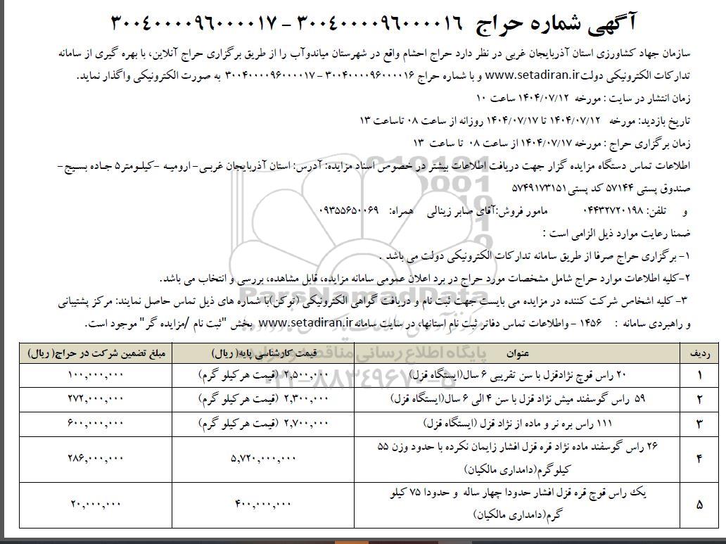 سازمان جهاد کشاورزی استان آذربایجان غربی در نظر دارد حراج احشام واقع در شهرستان میاند و آب را از طریق برگزاری حراج آنلاین، با بهره گیری از سامانه تدارکات الکترونیکی دولت www.setadiran.ir و با شماره حراج 3004000096000016 - 3004000096000017 به صورت الکترونیکی واگذار نماید.