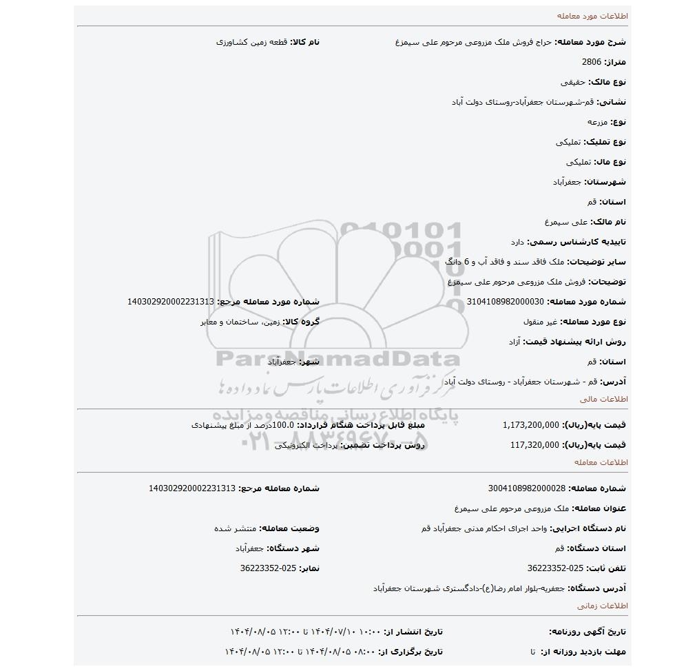 | شرح مورد معامله: حراج فروش ملک مزروعی مرحوم علی سیمزغ | نام کالا: قطعه زمین کشاورزی | |