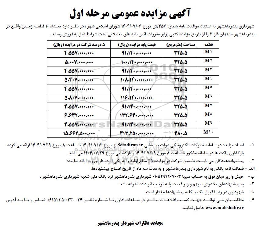 شهرداری بندر ماهشهر به استناد موافقت نامه شماره 456.ش مورخ 1404.07.06 شورای اسلامی شهر در نظر دارد تعداد 10 قطعه زمین واقع در بندر ماهشهر - انتهای فاز 3 را از طریق مزایده کتبی برابر مقررات آئین نامه های معاملاتی تحت شرایط ذیل به فروش رساند.