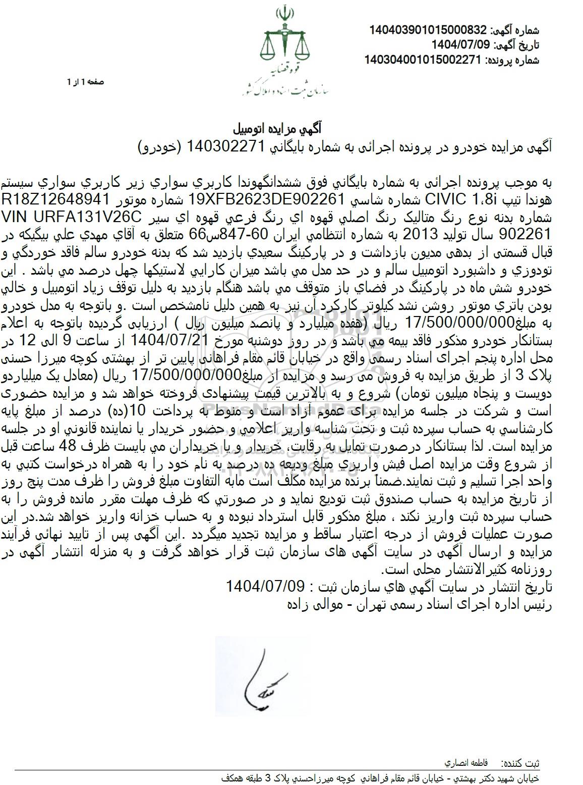 آگهی مزایده خودرو در پرونده اجرائی به شماره بایگانی 140302271 (خودرو)