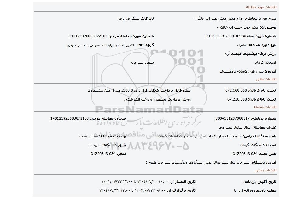 نام دستگاه اجرایی: شعبه مزایده اجرای احکام مدنی سیرجان استان کرمانوضعیت معامله: منتشر شده
