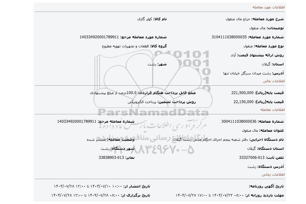 شرح مورد معامله: حراج مال منقول نام کالا: کولر گازی