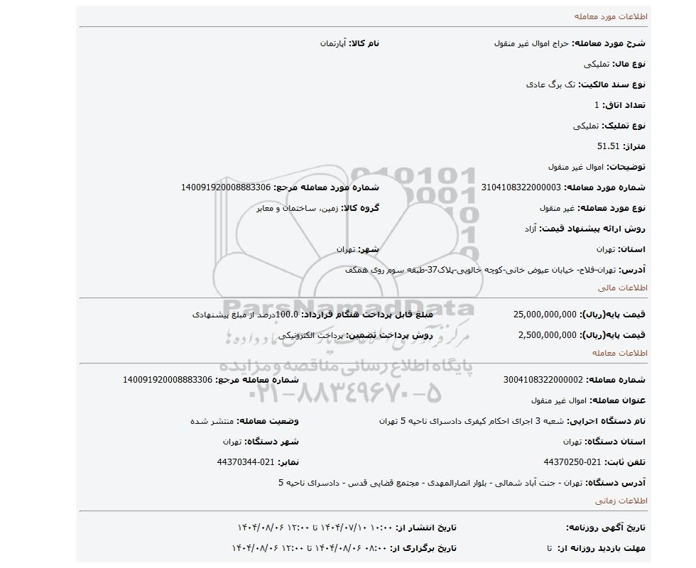 | شرح مورد معامله: حراج اموال غیر منقول | نام کالا: آپارتمان | |