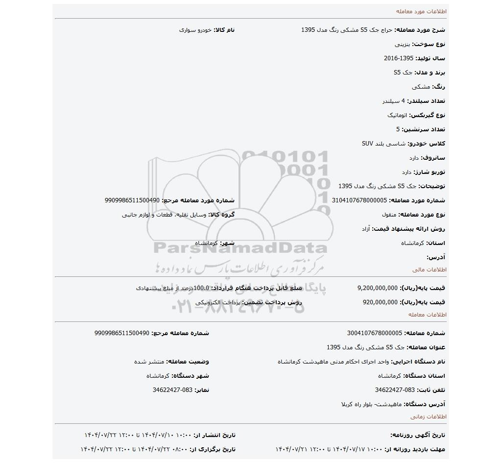 مزایده عمومی مزایده جک S5 مشکی رنگ مدل 1395 برگزار میگردد. از کلیه افراد متخصص و شرکتهای واجد شرایط دعوت به عمل میآید تا در این مزایده با کد خبرگزاری پارس نماد : 9635268 شرکت نمایند تاریخ شروع مزایده : 1404/07/10 مهلت شرکت در مزایده: تا پایان روز 1404/07/22 مکان برگزاری اموال واگذاری استانهای کرمانشاه و دستهبندیهای مربوط به این حراجی انواع خودرو سبک میباشد.