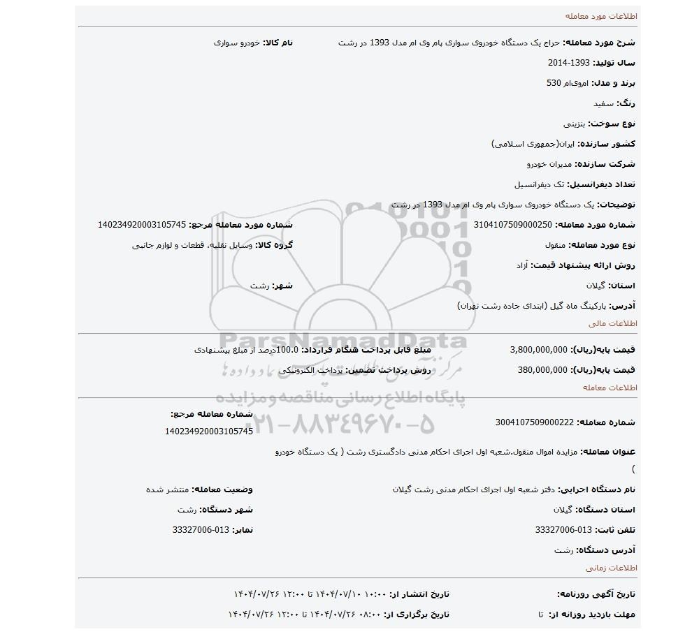 | شرح مورد معامله: حراج یک دستگاه خودروی سواری پام وی ام مدل 1393 در رشت | نام کالا: خودرو سواری | |