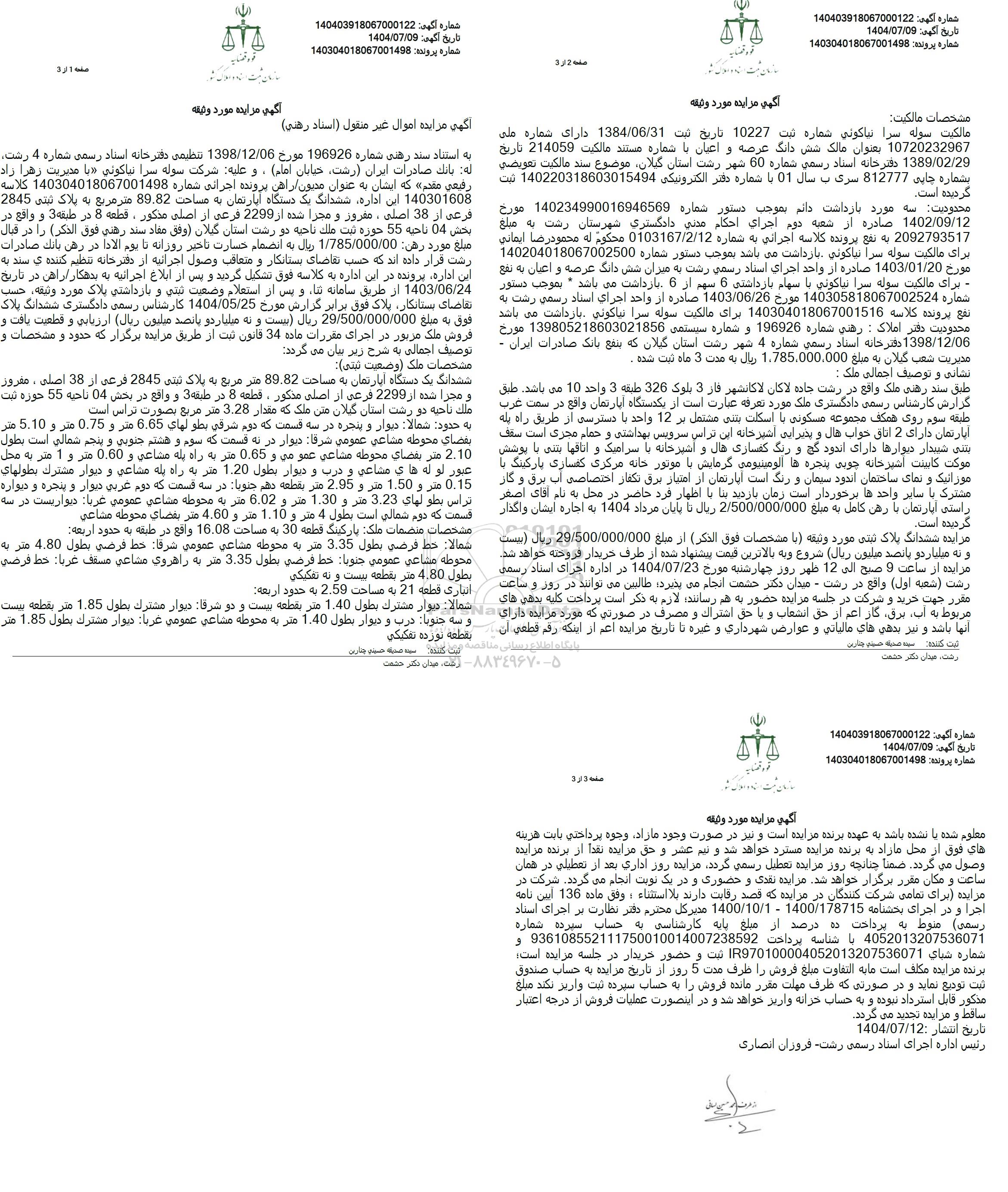 مزایده ششدانگ یک دستگاه آپارتمان به مساحت 89.82 مترمربع به پلاک ثبتی 2845 فرعی از 38 اصلی , مزایده ششدانگ یک دستگاه آپارتمان به مساحت 89.82 مترمربع به پلاک ثبتی 2845 فرعی از 38 اصلی