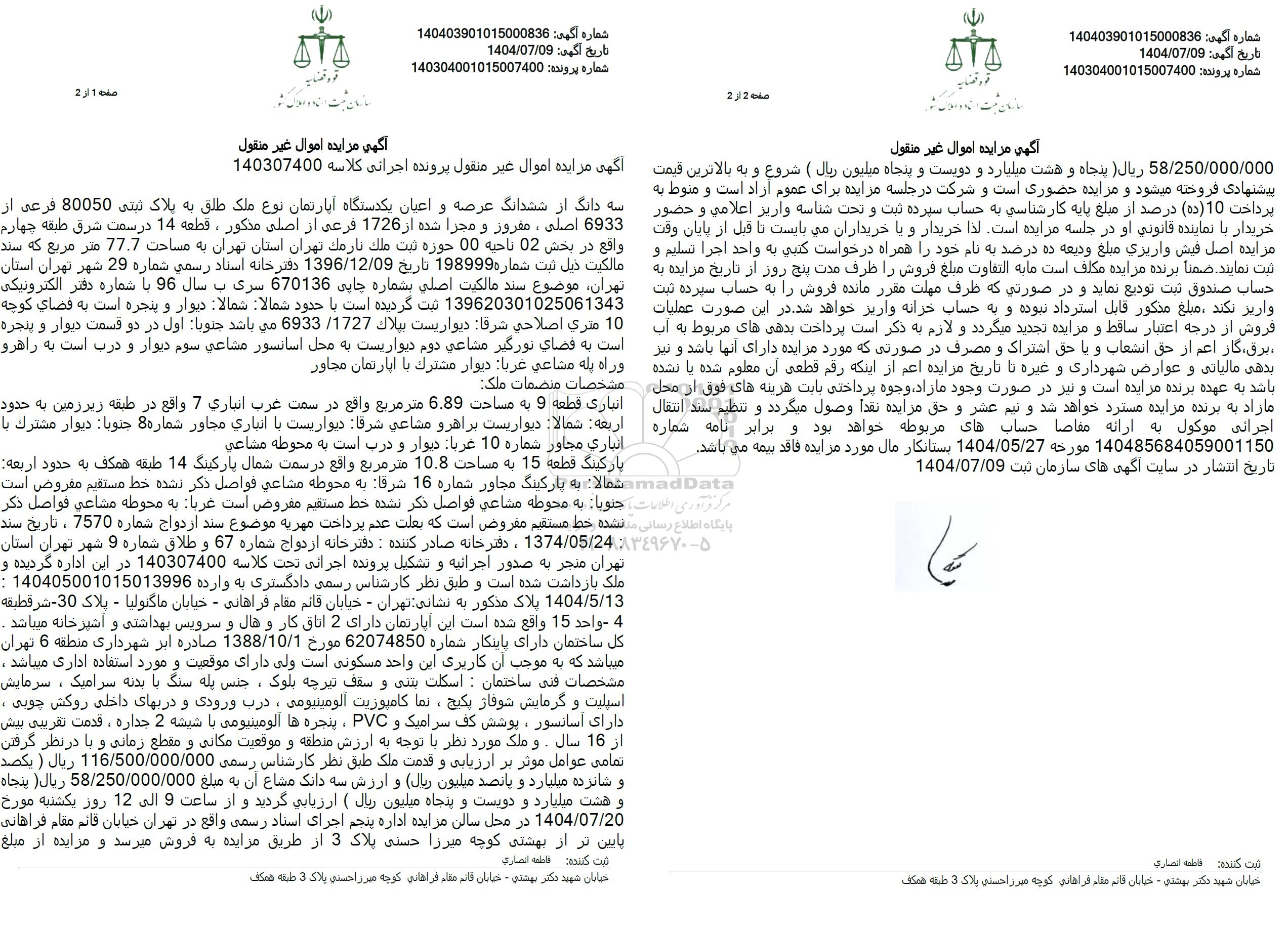 پارکینگ قطعه 15 به مساحت 10.8 متر مربع واقع در سمت شمال پارکینگ 14 طبقه همکف به حدود اربعه شمالا به پارکینگ مجاور شماره 16 شرقا به محوطه مشاعی فواصل ذکر نشده خط مستقیم مفروض است. جنوبا به محوطه مشاعی فواصل ذکر نشده خط مستقیم مفروض است غربا به محوطه مشاعی فواصل ذكر نشده خط مستقیم مفروض است که بعلت عدم پرداخت مهریه موضوع سند ازدواج شماره 7570 ، تاریخ سند : 1374.05.24 ، دفترخانه صادر کننده : دفترخانه ازدواج شماره 67 و طلاق شماره 9 شهر تهران استان تهران منجر به صدور اجرائیه و تشکیل پرونده اجرائی تحت کلاسه 140307400 در این اداره گردیده و ملک بازداشت شده است و طبق نظر کارشناس رسمی دادگستری به وارده 140405001015013996 : 1404.5.13 پلاک مذکور به نشانی تهران - خیابان قائم مقام فراهانی - خیابان ماگنولیا - پلاک 30 - شر قطبقه 4 - واحد 15 واقع شده است این آپارتمان دارای 2 اتاق کار و هال و سرویس بهداشتی و آشپرخانه میباشد . کل ساختمان دارای پاینکار شماره 62074850 مورخ 1388.10.18 صادره ابر شهرداری منطقه 6 تهران میباشد که به موجب آن کاربری این واحد مسکونی است ولی دارای موقعیت و مورد استفاده اداری میباشد . مشخصات فنی ساختمان : اسکلت بتنی و سقف تیرچه بلوک ، جنس پله سنگ با بدنه سرامیک ، سرمایش اسپلیت و گرمایش شوفاژ پکیج ، نما کامپوزیت آلومینیومی، درب ورودی و دربهای داخلی روکش چوبی . دارای آسانسور، پوشش کف سرامیک و PVC ، پنجره ها آلومینیومی با شیشه 2 جداره ، قدمت تقریبی پیش از 16 سال و ملک مورد نظر با توجه به ارزش منطقه و موقعیت مکانی و مقطع زمانی و با در نظر گرفتن تمامی عوامل موثر بر ارزیابی و قدمت ملک طبق نظر کارشناس رسمی 116.500.000.000 ریال ( یكصد و شانزده میلیارد و پانصد میلیون ریال و ارزش سه دانک مشاع آن به مبلغ 58.250.000.000 ریال ( پنجاه و هشت میلیارد و دویست و پنجاه میلیون ریال ( ارزیابی گردید و از ساعت 9 الی 12 روز یکشنبه مورخ 1404.07.20 در محل سالن مزایده اداره پنجم اجرای اسناد رسمی واقع در تهران خیابان قائم مقام فراهانی پایین تر از بهشتی کوچه میرزا حسنی پلاک 3 از طریق مزایده به فروش میرسد و مزایده از مبلغ 58.250.000.000 ریال (پنجاه و هشت میلیارد و دویست و پنجاه میلیون ریال ) شروع و به بالاترین قیمت پیشنهادی فروخته میشود و مزایده حضوری است و شرکت در جلسه مزایده برای عموم آزاد است و منوط به پرداخت 10 (ده) درصد از مبلغ پایه کارشناسی به حساب سپرده ثبت و تحت شناسه واریز اعلامی و حضور خریدار با نماینده قانونی او در جلسه مزایده است. لذا خریدار و یا خریداران می بایست تا قبل از پایان وقت مزایده اصل فیش واریزی مبلغ ودیعه ده درصد به نام خود را همراه درخواست کتبی به واحد اجرا تسلیم و ثبت نمایند. ضمنا برنده مزایده مکلف است مابه التفاوت مبلغ فروش را ظرف مدت پنج روز از تاریخ مزایده به حساب صندوق ثبت تودیع نماید و در صورتی که ظرف مهلت مقرر مانده فروش را به حساب سپرده ثبت واریز نکند مبلغ مذکور قابل استرداد نبوده و به حساب خزانه واریز خواهد شد. در این صورت عملیات فروش از درجه اعتبار ساقط و مزایده تجدید میگردد و لازم به ذکر است پرداخت بدهی های مربوط به آب برق گاز اعم از حق انشعاب و یا حق اشتراک و مصرف در صورتی که مورد مزایده دارای آنها باشد و نیر بدهی مالیاتی و عوارض شهرداری و غیره تا تاریخ مزایده اعم از اینکه رقم قطعی آن معلوم شده یا نشده باشد به عهده برنده مزایده است و نیز در صورت وجود مازاد وجوه پرداختی بابت هزینه های فوق از محل مازاد به برنده مزایده مسترد خواهد شد و نیم عشر و حق مزایده نقدا وصول میگردد و تنظیم سند انتقال اجرانی موکول به ارائه مفاصا حساب های مربوطه خواهد بود و برابر نامه شماره 140485684059001150 مورخه 1404.05.27 بستانکار مال مورد مزایده فاقد بیمه می باشد. تاریخ انتشار در سایت آگهی های سازمان ثبت 1404.07.09