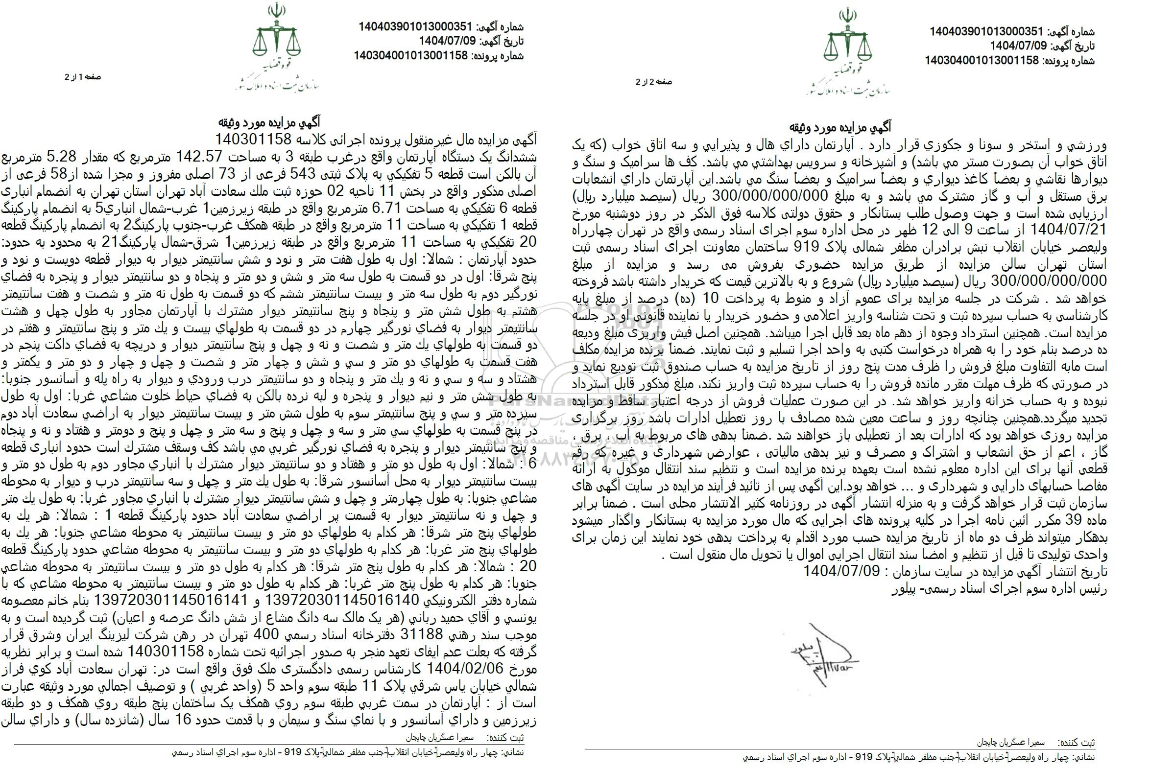 آگهی مزایده مال غیر منقول پرونده اجرائی کلاسه 140301158 ششدانگ یک دستگاه آپارتمان واقع در غرب طبقه 3 به مساحت 142.57 متر مربع که مقدار 5.28 متر مربع ان بالکن است قطعه 5 تفکیکی به پلاک ثبتی 543 فرعی از 73 اصلی مفروز و مجزا شده از 58 فرعی از اصلی مذکور واقع در بخش 11 ناحیه 02 حوزه ثبت ملک سعادت آباد تهران استان تهران به انضمام انباری قطعه 6 تفکیکی به مساحت 6.71 متر مربع واقع در طبقه زیر زمین 1 غرب شمال انباری 5 به انضمام پارکینگ قطعه 1 تفکیکی به مساحت 11 متر مربع واقع در طبقه همکف غرب جنوب پارکینگ 2 به انضمام پارکینگ قطعه 20 تفکیکی به مساحت 11 متر مربع واقع در طبقه زیر زمین 1 شرق شمال پارکینگ 21 به محدود به حدود حدود اپارتمان : شمالا اول به طول هفت متر و نود و شش سانتیمتر دیوار به دیوار قطعه دویست و نود و پنج شرقا اول در دو قسمت به طول سه متر و شش و دو متر و پنجاه و دو سانتیمتر دیوار و پنجره به فضای نورگیر دوم به طول سه متر و بیست سانتیمتر ششم که دو قسمت به طول نه متر و شصت و هفت سانتیمتر هشتم به طول شش متر و پنجاه و پنج سانتیمتر دیوار مشترک با آپارتمان مجاور به طول چهل و هشت سانتیمتر دیوار به فضای نورگیر چهارم در دو قسمت به طولهای بیست و یک متر و پنج سانتیمتر و هفتم در دو قسمت به طولهای یک متر و شصت و نه و چهل و پنج سانتیمتر دیوار و دریچه به فضای داکت پنجم در هفت قسمت به طولهای دو متر و سی و شش و چهار متر و شصت و چهل و چهار و دو متر و یکمتر و هشتاد و سه و سی و نه و یک متر و پنجاه و دو سانتیمتر درب ورودی و دیوار به راه پله و آسانسور جنوبا به طول شش متر و نیم دیوار و پنجره و لبه نرده بالکن به فضای حیاط خلوت مشاعی غربا اول به طول سیزده متر و سی و پنج سانتیمتر سوم به طول شش متر و بیست سانتیمتر دیوار به اراضی سعادت آباد دوم در پنج قسمت به طولهای سی متر و سه و چهل و پنج و سه متر و چهل و پنج و دومتر و هفتاد و نه و پنجاه و پنج سانتیمتر دیوار و پنجره به فضای نورگیر غربی می باشد کف و سقف مشترک است حدود انباری قطعه 6 : شمالا: اول به طول دو متر و هفتاد و دو سانتیمتر دیوار مشترک با انباری مجاور دوم به طول دو متر و بیست سانتیمتر دیوار به محل آسانسور شرقا به طول یک متر و چهل و سه سانتیمتر درب و دیوار به محوطه مشاعی جنوبا به طول چهارمتر و چهل و شش سانتیمتر دیوار مشترک با انباری مجاور غربا به طول یک متر و چهل و نه سانتیمتر دیوار به قسمت بر اراضی سعادت آباد حدود پارکینگ قطعه 1 : شمالا هر یک به طولهای پنج متر شرقا هر کدام به طولهای دو متر و بیست سانتیمتر به محوطه مشاعی جنوبا هر یک به طولهای پنج متر غربا هر کدام به طولهای دو متر و بیست سانتیمتر به محوطه مشاعی حدود پارکینگ قطعه 20 : شمالا هر کدام به طول پنج متر شرقا هر کدام به طول دو متر و بیست سانتیمتر به محوطه مشاعی جنوبا هر کدام به طول پنج متر غربا هر کدام به طول دو متر و بیست سانتیمتر به محوطه مشاعی که با شماره دفتر الکترونیکی 139720301145016140 و 139720301145016141 بنام خانم معصومه یونسی و آقای حمید ربانی هر یک مالک سه دانگ مشاع از شش دانگ عرصه و اعیان ثبت گردیده است و به موجب سند رهنی 31188 دفترخانه اسناد رسمی 400 تهران در رهن شرکت لیزینگ ایران و شرق قرار گرفته که بعلت عدم ایفای تعهد منجر به صدور اجرائیه تحت شماره 140301158 شده است و برابر نظریه مورخ 1404/02/06 کارشناس رسمی دادگستری ملک فوق واقع است در تهران سعادت آباد کوی قرار شمالی خیابان پاس شرقی پلاک 11 طبقه سوم واحد 5 واحد غربی ) و توصیف اجمالی مورد وثیقه عبارت است از : آپارتمان در سمت غربی طبقه سوم روی همکف یک ساختمان پنج طبقه روی همکف و دو طبقه زیرزمین و دارای آسانسور و با نمای سنگ و سیمان و با قدمت حدود 16 سال شانزده سال و دارای سالن ورزشی و استخر و سونا و جکوزی قرار دارد. آپارتمان دارای هال و پذیرایی و سه اتاق خواب که یک اتاق خواب آن بصورت مستر می باشد و آشپزخانه و سرویس بهداشتی می باشد. کف ها سرامیک و سنگ و دیوارها نقاشی و بعضا کاغذ دیواری و بعضا سرامیک و بعضاً سنگ می باشد. این آپارتمان دارای ان