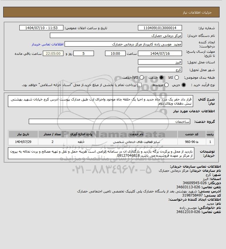 شرح کلی نیاز: قرار داد حفر یک عدد چاه جدید و احیا یک حلقه چاه موجود واجرای ارت طبق مدارک پیوست