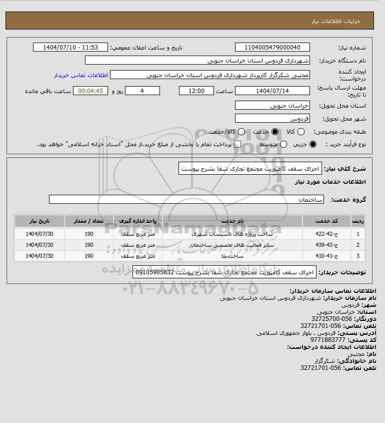 توضیحات خریدار:اجرای سقف کامپوزیت مجتمع تجاری شفا بشرح پیوست 09105905832