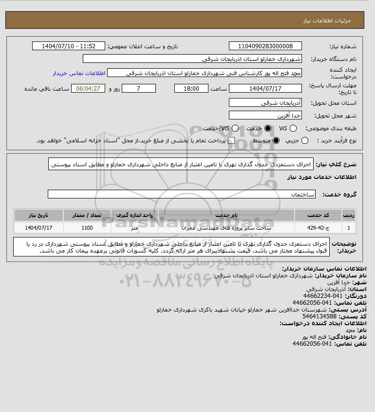 شرح کلی نیاز: اجرای دستمزدی جدول گذاری نهری با تامین اعتبار از منابع داخلی شهرداری خمارلو و مطابق اسناد پیوستی