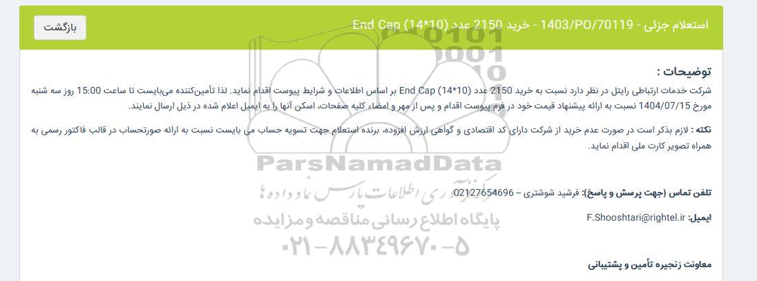 استعلام جزئی - 70119/ PO / 1403 -  خرید 2150 عدد END CAP 10*14؟