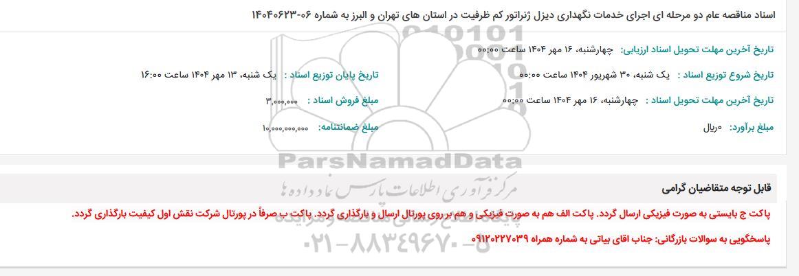 اسناد مناقصه عام دو مرحله ای اجرای خدمات نگهداری دیزل ژنراتور کم ظرفیت در استانهای تهران و البرز به شماره 06-14040623