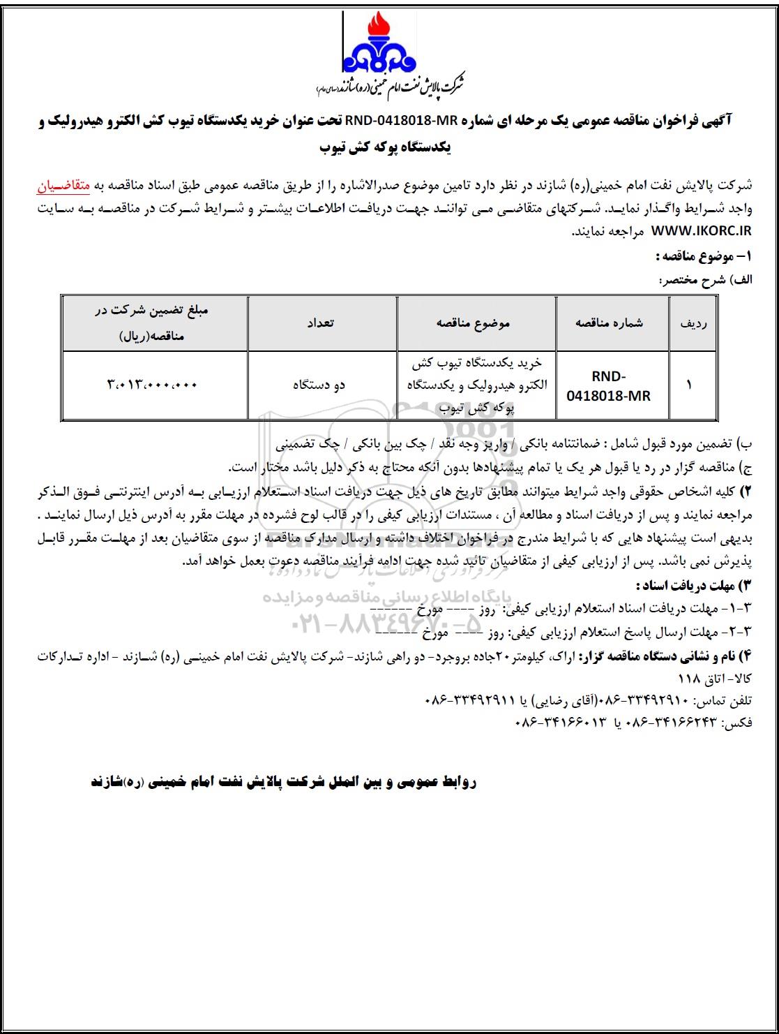 آگهی فراخوان مناقصه عمومی یک مرحله ای شماره ه RND- 0418018 -MR تحت عنوان خرید یک دستگاه تیوب کش الکتروهیدرولیک و یکدستگاه پوکه کش تیوب